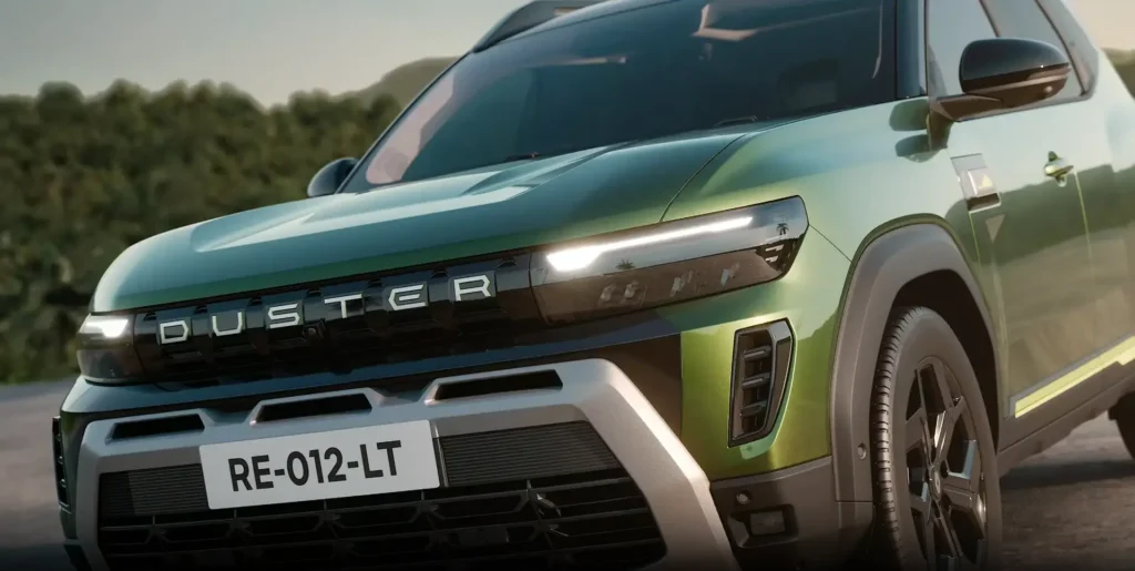 - Front Profile: The face is dominated by a sleek grille featuring bold ‘DUSTER’ lettering. It gets new Y-shaped LED DRLs that give it a distinct, robotic light signature.